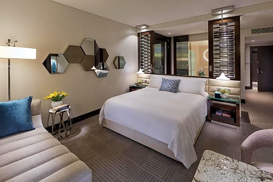 The Premier Suite includes a separate living and dining area with lounge and private bedroom with one king bed and walk-in closet. Th bathroom includes a deep soaking bath, walk in rain shower.